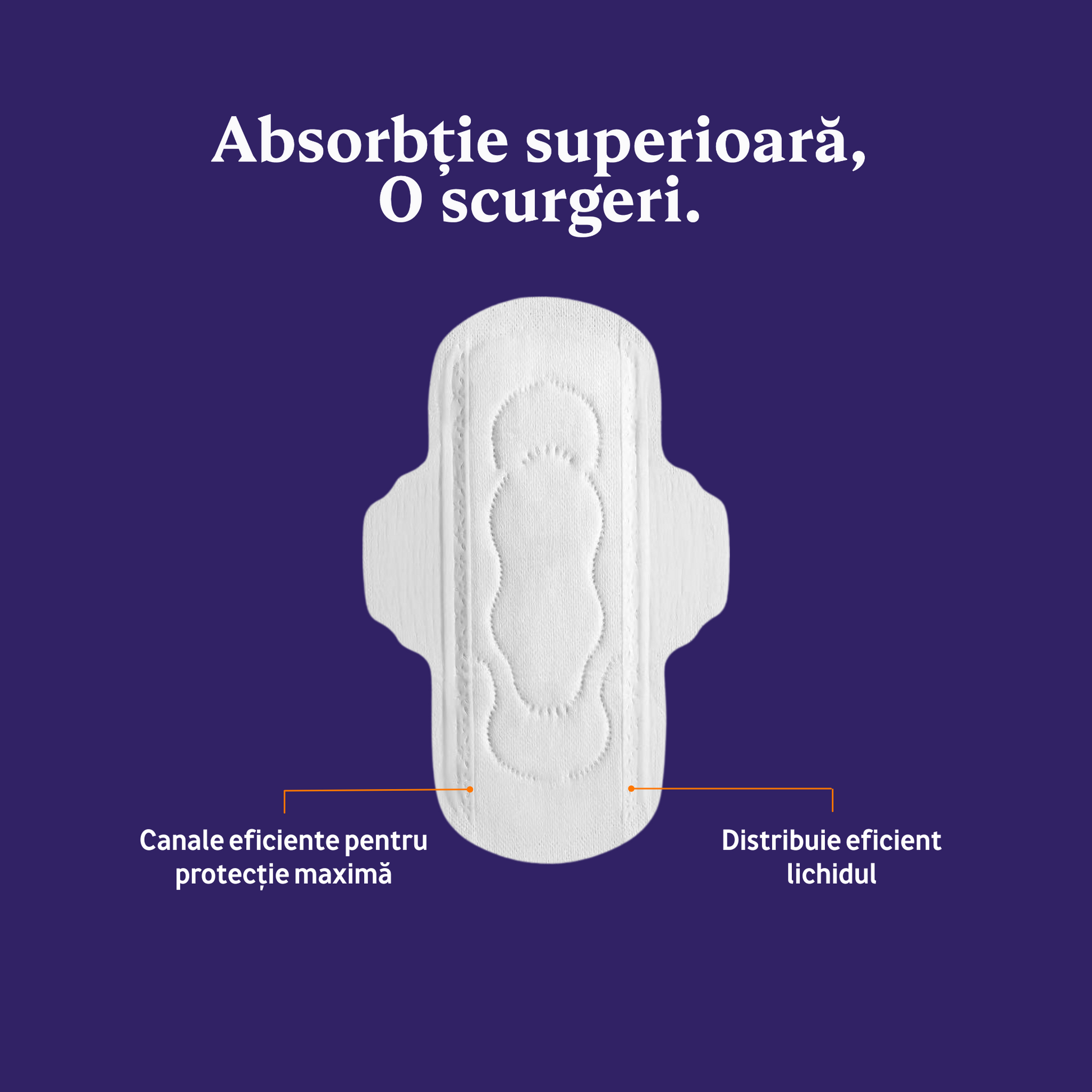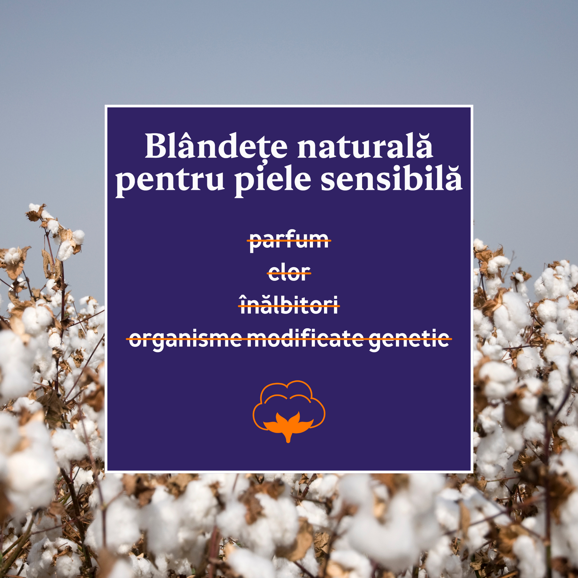 Delicate cu pielea sensibilă, absorbantele din bumbac organic oferă protecție superioară anti-scurgeri.